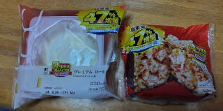 買い物の際、ローソンで「盛りすぎチャレンジ」の「盛りすぎ! プレミアムロールケーキ」と「盛りすぎ! チャーシューマヨネーズおにぎり」を入手できた。