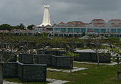 | 2006年03月21日 火曜日 春分の日 朝、まずはネットやメールを処理して、8時20分にホテルから外出。 でもって、道路沿いの喫茶店で洋風の朝定食を食べた。が、よく見ると沖縄そばの定食などもあって、ちょっと後悔。せっかく沖縄に来たんだからな〜。ちっ(^^; それから向かったのは、観光バス乗り場。実は昨日、沖縄南部の定期観光バスを予約していたんだな。ツアーってのはイマイチ趣味じゃないんだが、免許を持っていながら筋金入りのペーパードライバーでレンタカーが怖くて使えない上に、初めての場所に行くとなると、数時間で見所をザックリ連れて行ってくれるこの手のツアーを利用しない手はない。 しかし、驚いたのは祝日だというのに、客が俺を含めて4名(男3,女1)しかいなかったこと。これで大型のバスを出すんだから、おそらく赤字じゃなかろうか?(^^;;; などと思いつつ、バスは最初の目的地の「旧海軍司令部壕」に向かって出発。 観光用に作られた入り口を下って行くと、そこは狭い洞窟みたいになっていて、沖縄戦の時はこんなところで作戦指揮をしていたのか、と驚くやら呆れるやら。なかでも兵の休憩室は、横になることすらままならない狭さで、立って寝てたとしか思えなかった。そりゃ、疲弊しまくるよなぁ。 などと思いつつ、壕を出たとき下の写真のようなものが目に入った。 (←これ)ガイドさんに聞いたら、墓だって言うんだよね。どう見ても、俺の常識にある墓の6倍以上の面積がありそう。霊園にある市川家の墓と比べたら、多分8〜10倍くらいあるだろう(^^; ガイドさんの話によると、なんでも昔の沖縄じゃ「結婚するなら相手の家の墓を見ろ」と言われるくらい墓が大事だったらしい。ようするに、生きているときの家は仮であって、死んで入る墓こそが本当の家という理屈だから、墓に金をかけるんだって。面白い感覚に、ちょっとビックリ。 続いて向かったのは、おなじみ「ひめゆりの塔」。沖縄戦で最大の悲劇とも言われるひめゆり学徒隊が祭られているところだ。 しかし、どうにもこうにもあれだけ整備されて観光客が沢山いると、どうにも悲劇の場所という重みがなくなっている気がした。また、しょせんはバスツアー故、記念館の記録映像などをじっくり見ている時間がなかったことも、こういうちょっと冷たい感想になってしまう要因の1つだろう。ああいうところは、腰を落ち着けて見たり、学徒隊の生き残りの話を聞かないとアカン。 また、ここで少し早めの昼食を取ったのだが、これが普通の和風弁当。つまんねー(^^; それから、今度は平和祈念公園へ。ここが沖縄戦終焉の地だそうで、23万人あまりの名前を刻んだ平和の礎(いしじ)などを見物。時間の関係もあって、俺は平和祈念資料館を見なかったのだが、見た人の話を聞いた限りでは、見ておいたほうがよかったようだ。まぁ、これもいずれ機会があったら、という感じかな? (←平和の礎と平和祈念堂と資料館)とりあえず、俺は公園内をブラブラしてサトウキビアイスなどパクついていたり(^^; 俺の味覚じゃ、サトウキビがどんな味かなんてよく分からんが、それでもおいしかったのは間違いない。 ちなみに、ここでバスが出発する前に、ガイドさんやツアー参加者と記念撮影を(^o^; この段階で、ショッピングセンターに寄るルートを飛ばす、という提案がガイドさんから出され、全員同意。つーか、俺はもともとショッピングセンターなんぞ行く必要なしと思っていたから、願ったり叶ったり。最初から、ルートに入れなきゃいいんだよな。 その後、さらに移動して玉泉洞という鍾乳洞見物へ。ここはテーマパークになっていて、けっこう繁盛していた。 鍾乳洞は、日本で2番目だかに大きいらしく、美しさでは東洋一とも言われているらしい。実際、ライトアップの効果などもあって、けっこう幻想的な雰囲気はあって良かった。好きな女性と一緒なら、きっとすごくいい感じだっただろうなぁ(-_-; (←こんな感じ)鍾乳洞を出たあと、テーマパークを見物。というか、テーマパークを見ないと駐車場に戻れないようになっているという、なかなか阿漕な作りになっていたり(^o^; しかし、椰子の実ジュースを飲んだり、ここでしか飲めないニヘデビールの生を飲んだりして、ちょっとご満悦(^o^) ただ、ハブ園を見ている時間がなく、また最後にゴーヤアイスを食べようと思った矢先に雨が降り始めたため、慌ててバスに戻った。 そうして、バスは那覇に戻り、解散と相成ったのである。 今回、ガイドさんともう一人、比較的若い(外見の)女性がいたものの、結局あまりお近づきにはならなかった。その理由は、単純に俺の好みじゃなかったってことな(^^;;; そんなことで、またまた国際通りに行った俺は、小腹が空いていたこともあって念願の公設市場2階の食堂で食事をすることにした。ただし、1階で買って2階で料理してもらうってのは、今回見送り。 でもって、1件目でビールと一緒にゴーヤチャンプルーを食った